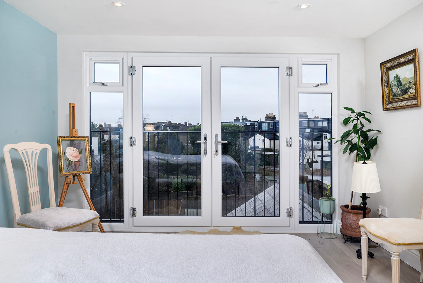 Dormer loft conversion featuring bedroom with juliet balcony and French doors